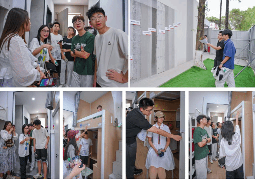 形象展示交大“好宿舍”外,样板间还将宿舍设计展示和工程知识有机结合,将基建场景拓展为实践育人新阵地。建筑学院学生王婧琪正在将课本上的墙体饰面做法与样板间的实物模型一一对照,她表示:“找平层、防水层、保温层,到样板间来对照学习后,原本抽象的知识点立马鲜活起来。”学生在参观中既能切身感受未来宿舍布局,又能参与设计优化建议征集,还能学习工程施工工艺,成为校园建设的参与者与受益者,实现“沉浸式学习”与“参与式建设”的双重目标。