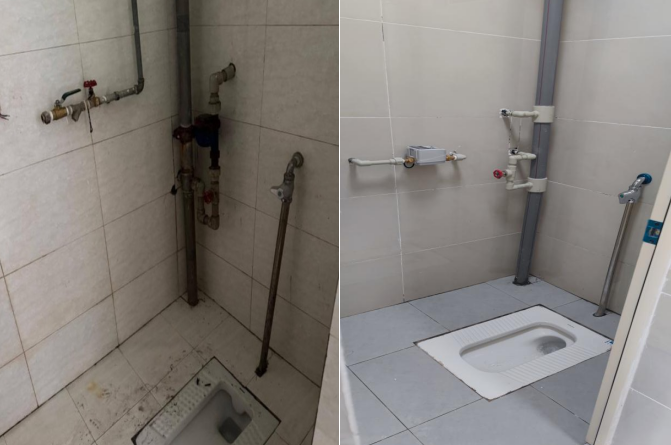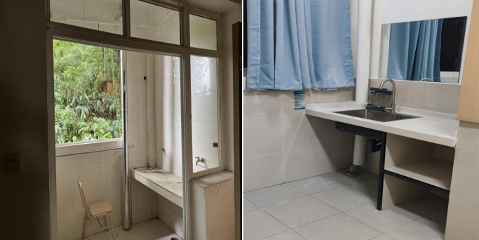 “以前阳台洗手台裂了缝,一用水就漏,热水管道在中间,晾衣服总碰到;厕所地面常年湿滑,关门还吱呀响。” 学生小张提起改造前的阳台厕所,满是无奈。这次改造从“使用细节”入手:洗手台换成不锈钢材质,耐用抗造还容易清洁,再也不会因裂缝漏水;厕所地面墙面重做防水,彻底解决渗水问题;热水管道移到角落,释放出更多空间,晾衣服、放杂物都方便。