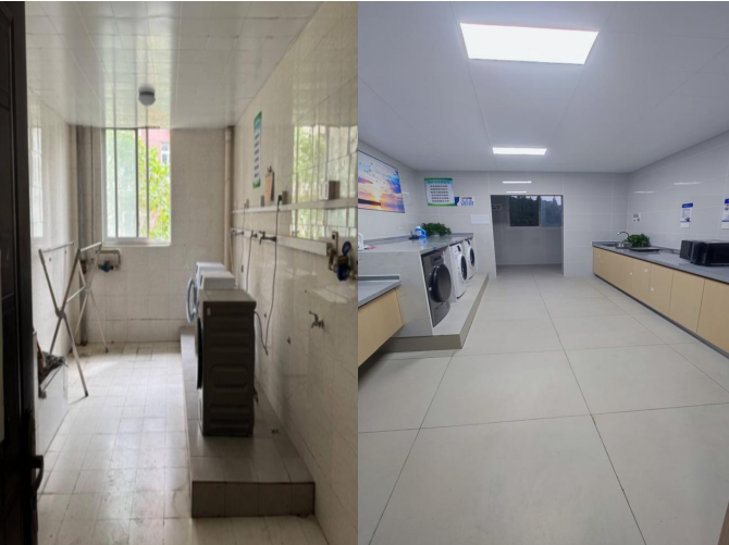 “以前洗被套要扛着大盆跑上下楼层,公共服务房又旧又挤,洗衣服没有操作台,也没微波炉加热食物。” 学生小王的话,道出了改造前的不便。这次修缮特意 “贴近学生日常”,在每栋楼的每层都规划了公共服务用房,配齐洗衣机、烘干机、电磁炉和防水吹风机 —— 不用再上下奔波,课间回宿舍就能处理衣物、加热餐食,日常需求在楼层内就能轻松解决。