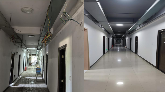 改造前,宿舍走廊天花板上,电线、网线像 “蜘蛛网” 似的垂着,部分套管开裂,既影响美观,又有安全隐患。建管处组织团队逐段梳理线路,将强电、弱电分类收纳进防火桥架与 PVC 槽板,槽板颜色与墙面协调,不突兀;因施工恰逢暑假学生离校,无需迁就留校时段,师傅们能集中精力推进工程,每天收工前还会清理走廊,确保施工环境整洁。