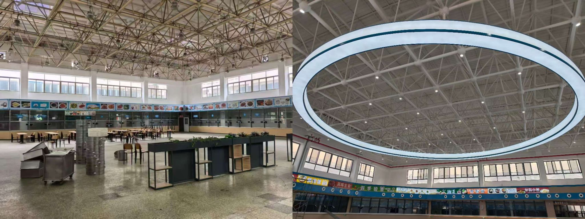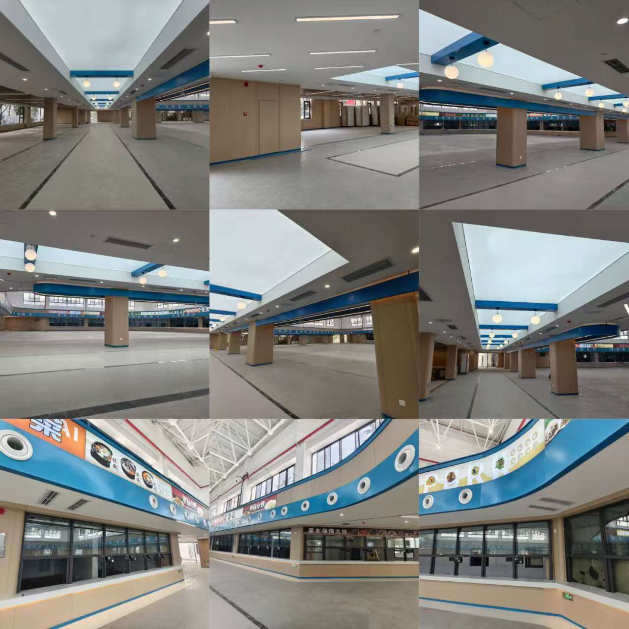 对食堂外立面整体进行了翻新,采用环保真石漆,整体风貌与校园环境和谐统一,提升了校园形象。弱电系统配备智能化设备,保障了就餐流程的数字化管理,如智能点餐和支付系统。安装了环绕式中央空调系统,设置了独立温控区域,九里三食堂就餐环境恶劣的历史一去不复返。